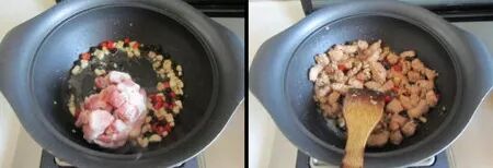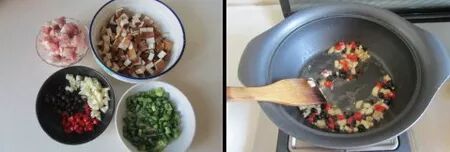 2.先爆香豆豉、大蒜和小米椒调味料,再下入五花肉,煸炒出其部分油脂,也就是表面微微焦黄;