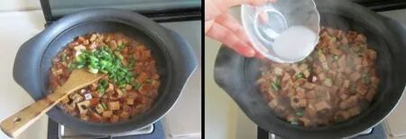 3.煸炒出香味后下入切好的五花肉丁一起翻炒;