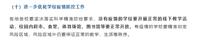 12月7日,国务院联防联控机制综合组发布《关于进一步优化落实新冠肺炎疫情防控措施的通知》,其中第十项指出“各地各校要坚决落实科学精准防控要求,没有疫情的学校要开展正常的线下教学活动”,各个学校开学计划已纳入日程。