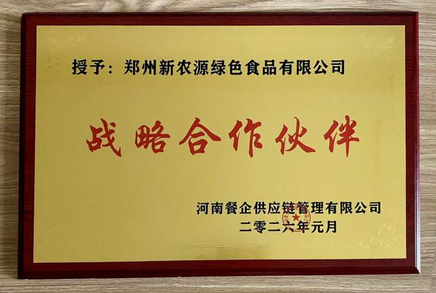 新年伊始,喜讯传来!2026年元月,河南餐企供应链管理有限公司郑州新农源绿色食品有限公司颁发战略合作伙伴牌。
