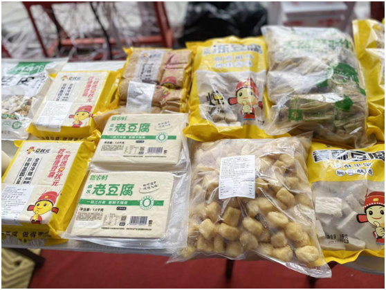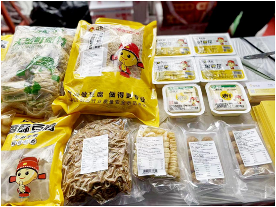 在产品展示区,豆状元的各类豆制品整齐摆放,散发着诱人的光泽。从嫩滑的豆腐到薄如蝉翼的鲜豆皮、口感醇厚的鲜腐竹,再到别具风味的冻豆腐、Q弹鲜美的松茸豆腐丸子等,丰富多样的产品种类让人目不暇接。每一款产品都以其精致的外观和独特的质地,吸引着过往的参观者驻足欣赏。